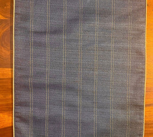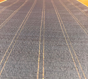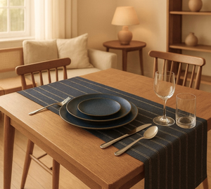 Our beautiful blue runner brings warmth and vibrance to any space with twin golden zari lines running across the entire width adding a touch of timeless grace. Its gentle dips create a flowing, elegant charm and it is finished with golden piping for a hint of regal sophistication.