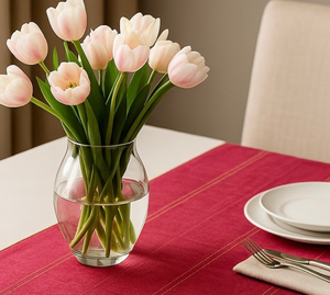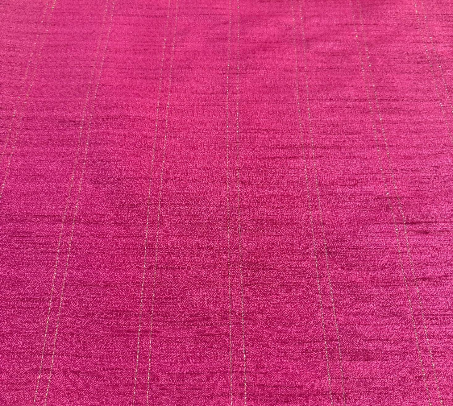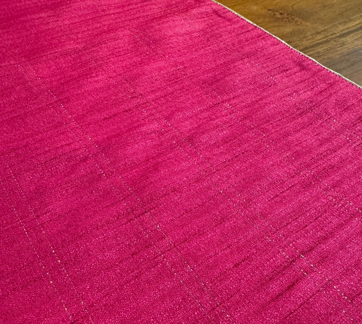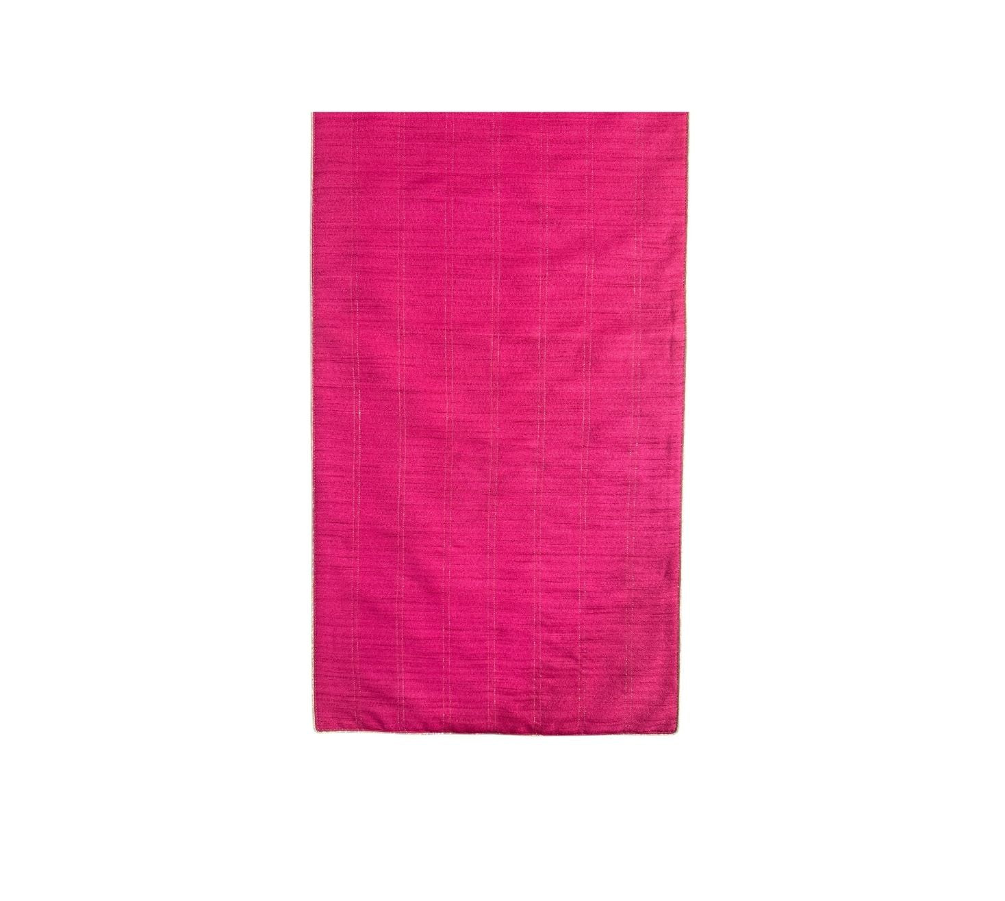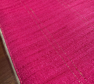 Our beautiful fuchsia runner brings warmth and vibrance to any space with twin golden zari lines running across the entire width adding a touch of timeless grace. Its gentle dips create a flowing, elegant charm and it is finished with golden piping for a hint of regal sophistication.
