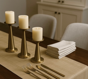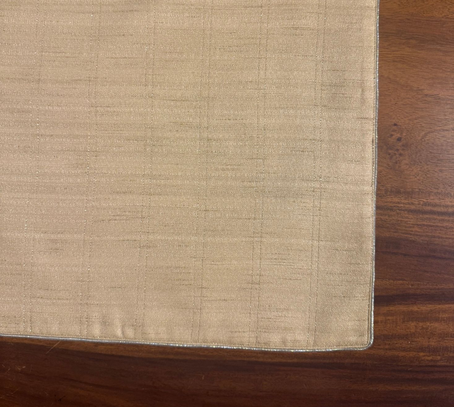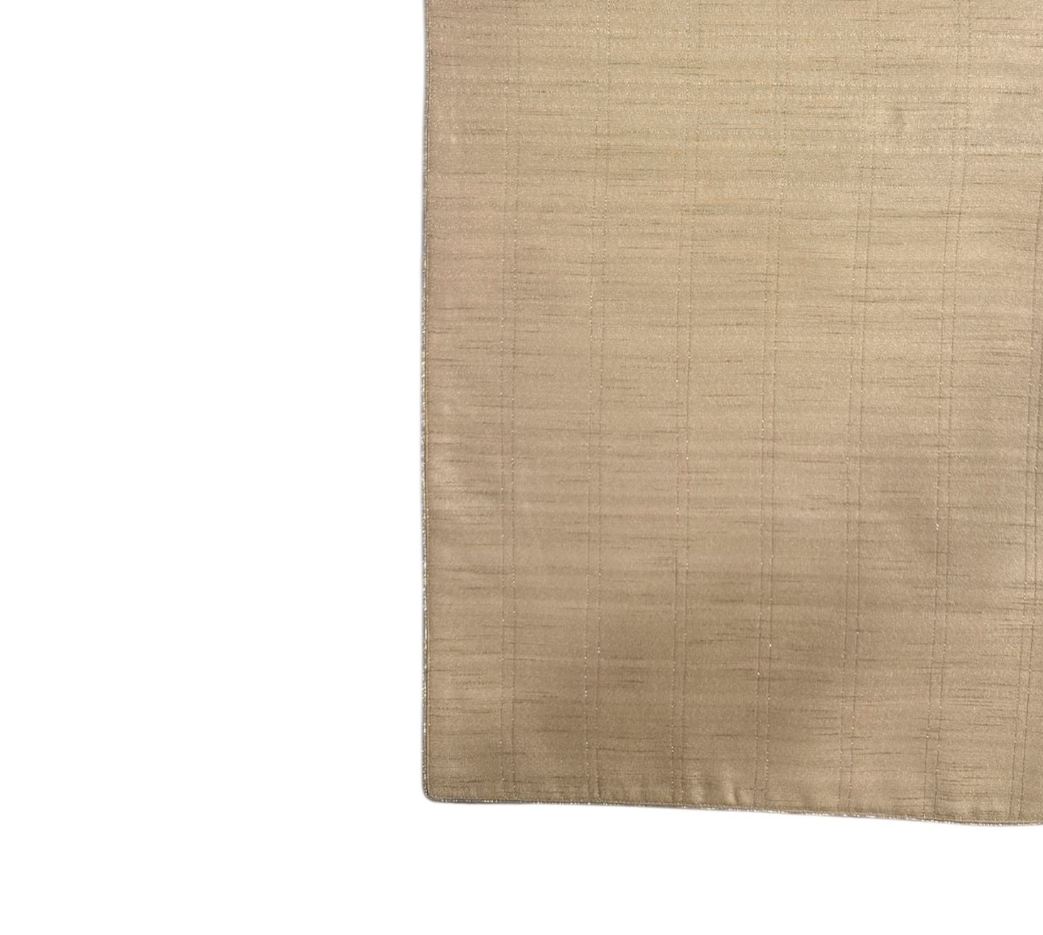Our beautiful gold runner brings warmth and vibrance to any space with twin golden zari lines running across the entire width adding a touch of timeless grace. Its gentle dips create a flowing, elegant charm and it is finished with golden piping for a hint of regal sophistication.
