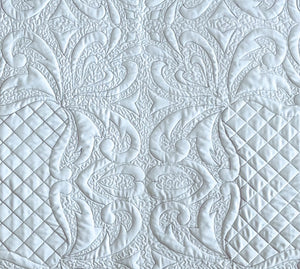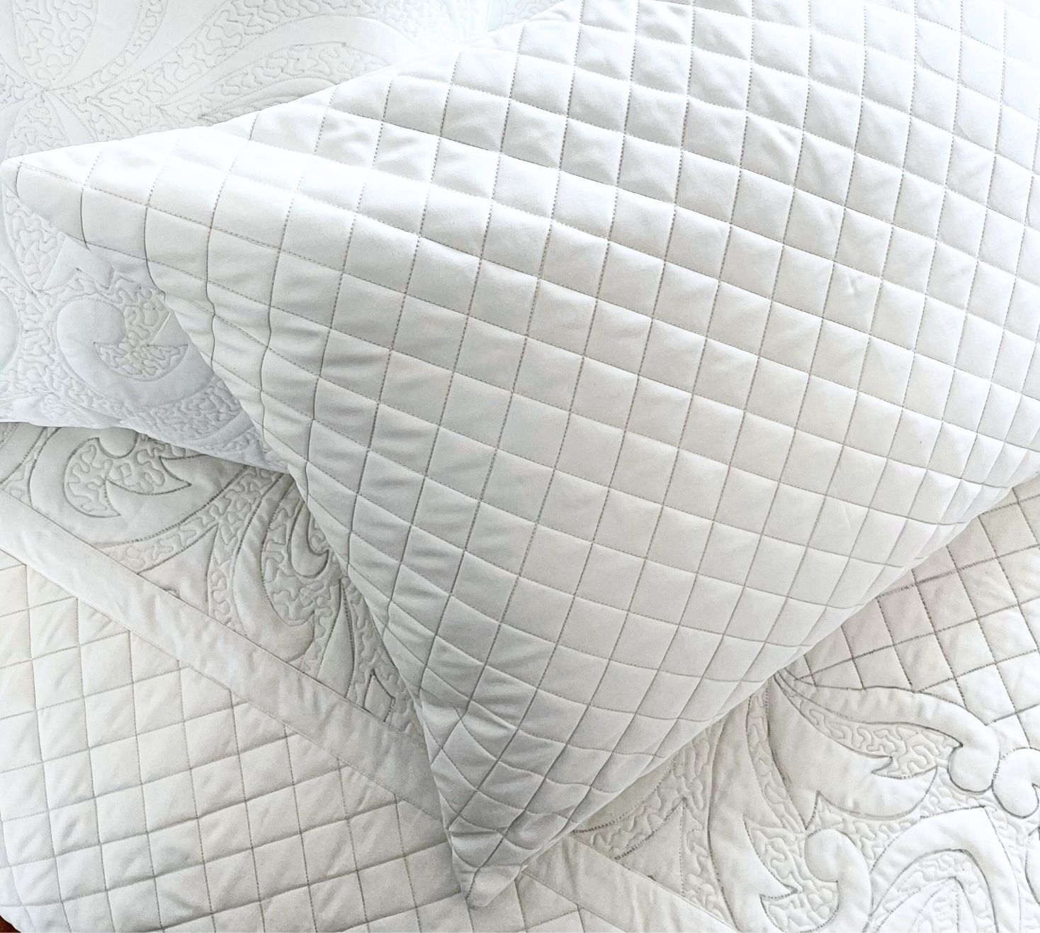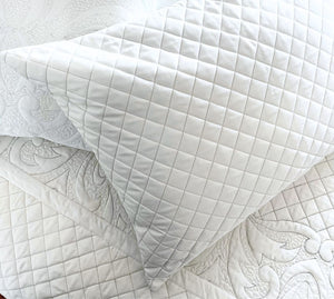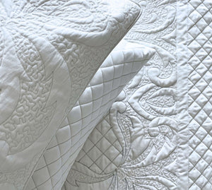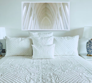 Inspired by French architecture, this formal white bed cover set is fully embroidered and is accompanied by an army of embellished cushions incorporating the same look. Common characteristics of the French style includes symmetry and proportion, which have some key exterior and interior feature, all of which contribute to the style.
