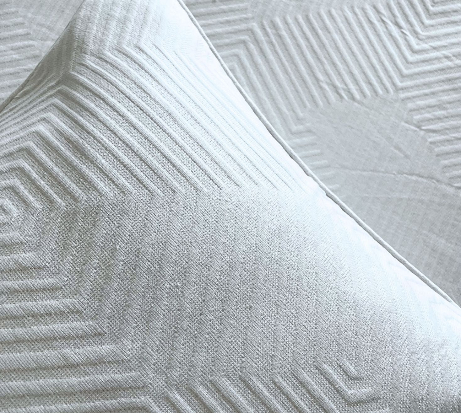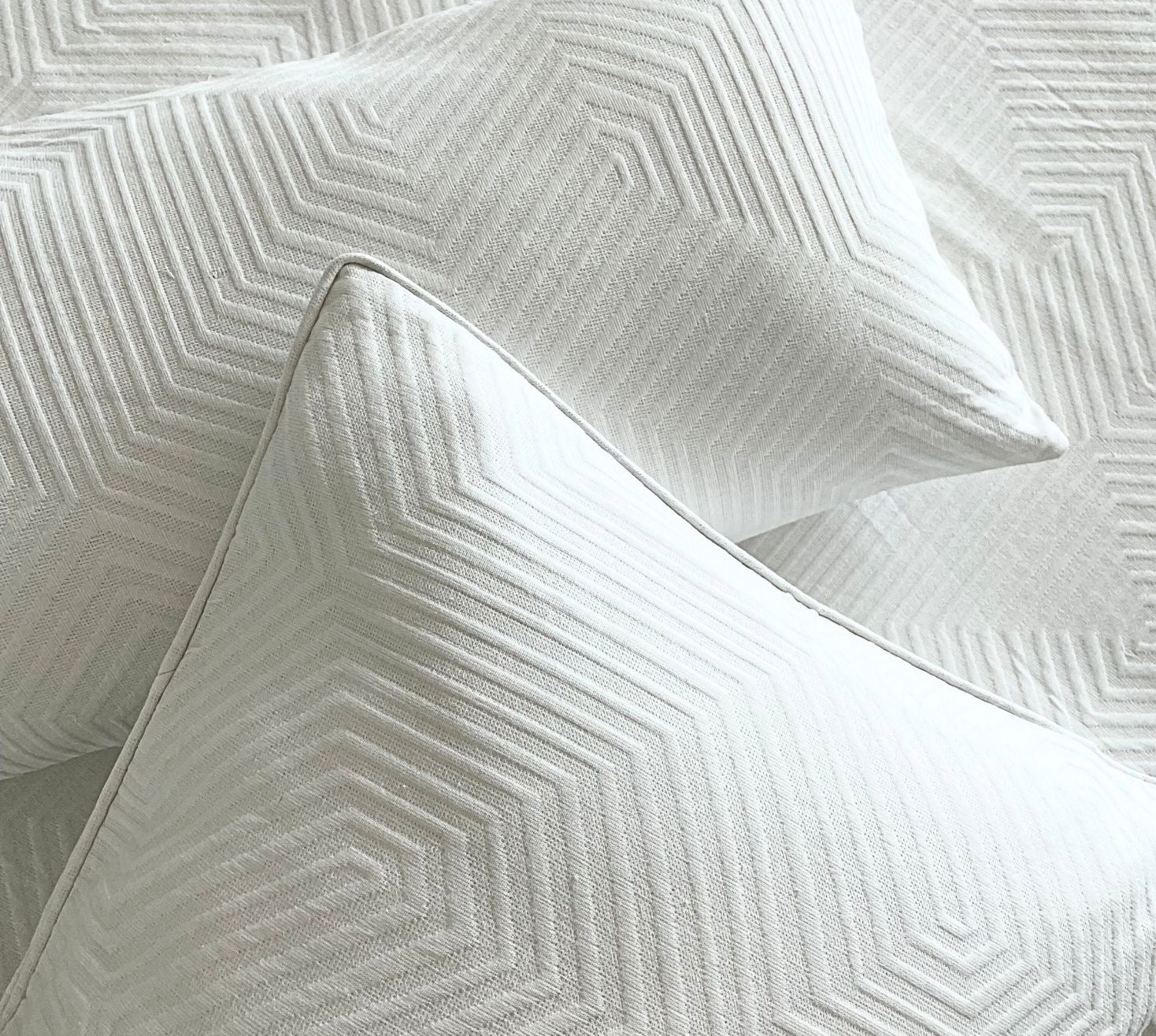 This pristine white jacquard king-sized non - quilted bed cover set is ethereal, luxurious and one that makes a powerful statement. A self-woven fabric in white cotton can elevate a room by accentuating any colored wood. With a global appeal, it is here to stay and is accompanied by a set of similar 6 cushions varying in size.