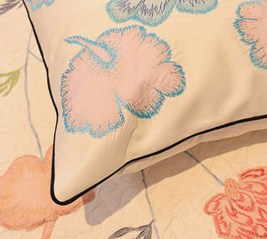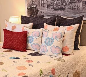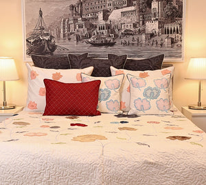 An efflorescent bed cover set in powder blues, serene peaches and peaceful greys is patch worked in satins and defined with silk threads. It's joyous bedding that exuberates life and results in happiness. The 3 big square cushions in 24 inch/24 inch are embroidered in white resham that also runs through the entire bedding. A set of matching shams, a pair of 16 inch/16 inch cushions and an ascent cushion bind the whole collection in soft cotton that can be used as a cover and a comforter. Its stylish and cheerful vibe will enhance your room and counts as a winner for summer bedding.