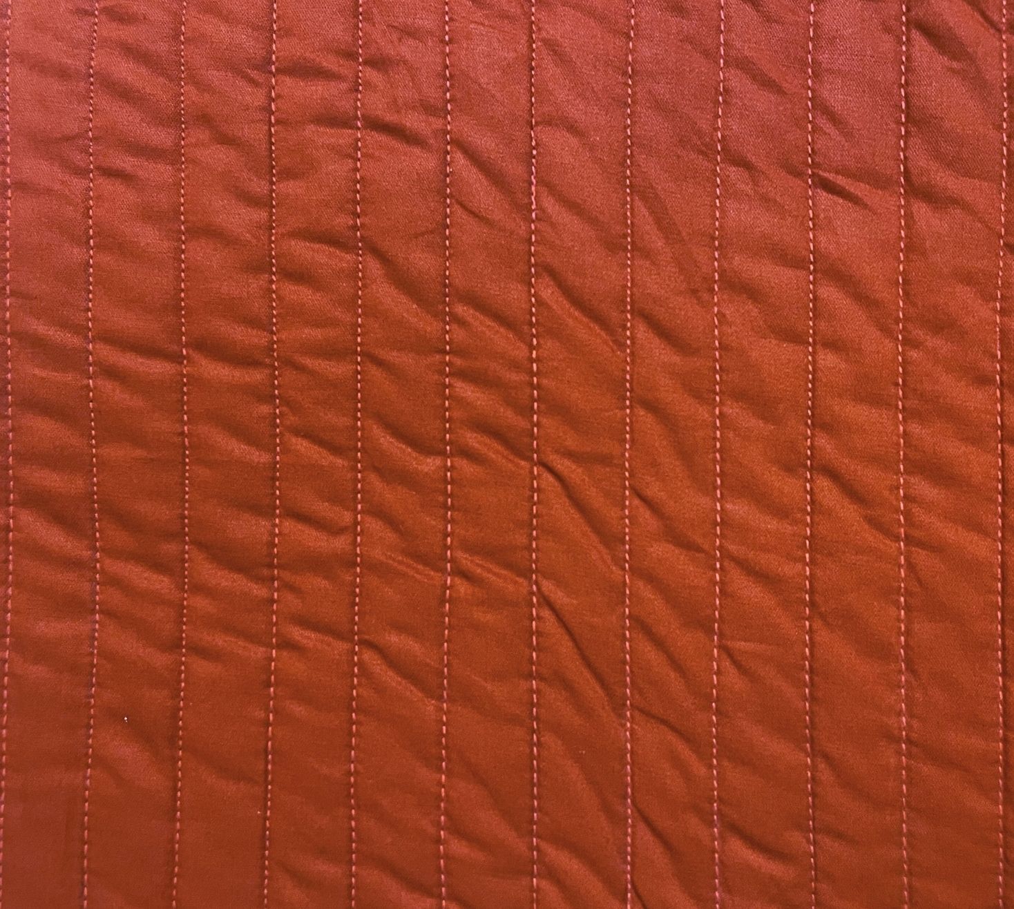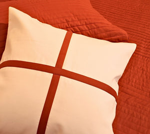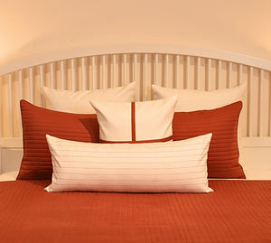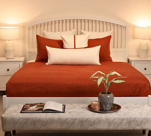 Made from soft cotton, the king sized quilted bed cover set is stitched in a vertical pattern. The bedding collection features 2 shams in rust, 2 cushions in 24/24 inch and 1 cushion 20/20 inch cushion which is patch worked upon and an ascent embroidered cushion for the centre. Handcrafted in fine cotton the collection looks stylish and vibrant yet understated in off-white and rust. The summer bedding serves effortlessly for a fresh and modern look.
